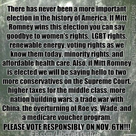 We, as voting women and our daughters and granddaughters need to vote with the knowledge that our votes will affect millions of American women. The ability to have access to birth control, reproductive education, how a rape victim is treated and defended and counseled in the future is up for grabs here. The GOP feels the body shuts down and a woman can’t get pregnant during a legitimate rape. What else will they decide is magically going to change for women? What excuses will they come up with to control women, our bodies and our minds?