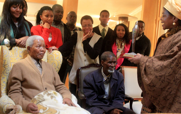 QUNU, SOUTH AFRICA – MAY 30 (SOUTH AFRICA OUT): Former South African president Nelson Mandela (L) receives the African Nation Congress’ centenary torch from their chairwoman Baleka Mbete at his home on May 30, 2012 in Qunu, South Africa. The original torch was lit during the party’s 100th birthday celebrations earlier this year, before a replica was presented to Mandela at his home, where he with celebrate his 94th birthday next month. (Photo by Daily Dispatch/Gallo Images/Getty Images)