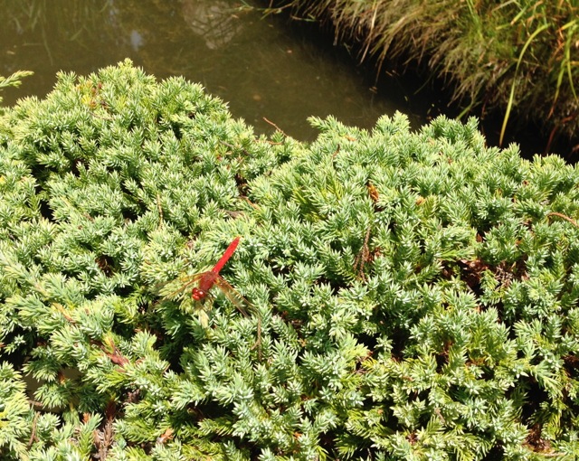 Note: This dragonfly was spotted in the Japanese Tea Garden in San Francisco, California. Best I can tell, he is a mature male Flame Skimmer dragonfly. He looks a lot like the European Red-Veined Darter or Nomad dragonfly. I have a Scarlet Cardinal living in my yard, and his black eyes often find me in my garden. This dragonfly reminded me of him, even when I was 3,000 miles from home.