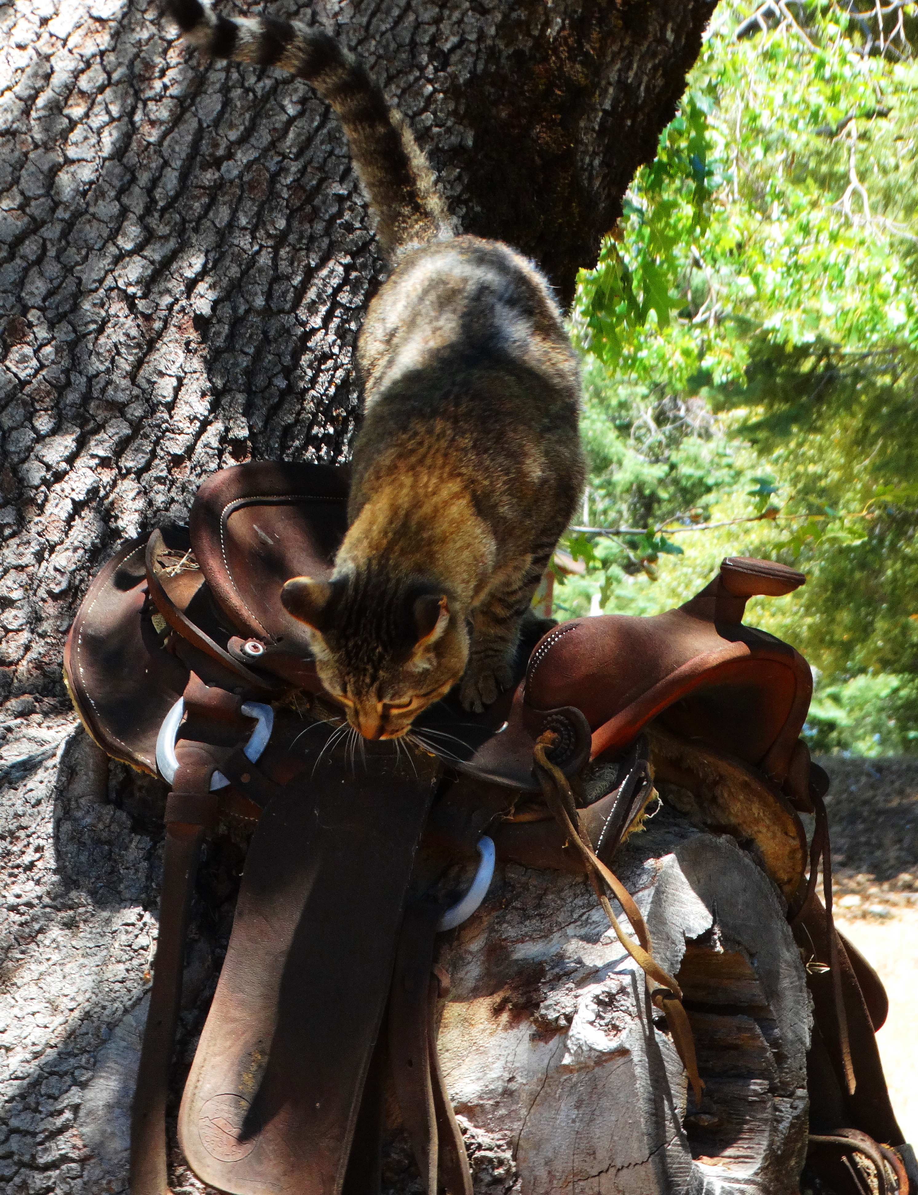 Domino likes to sleep in his saddle in his tree on the mountain. All cats like to sleep in their saddles, not just cowboys like you probably thought.