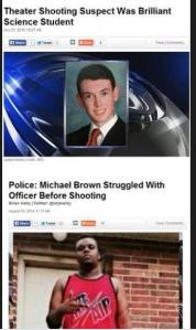 The media has a way of portraying young African American males in a very negative light. With everything that has been going on in Ferguson, MO the pictures that we see of Michael Brown Jr. are ‘gangster-like’ and don’t show him to be the innocent victim that he is. White people are shown in a completely different light. Instead of selecting a photo of Michael Brown Jr. smiling or with family, they keep showing the picture of him looking mean outdoors in a sports jersey, whereas Whites are often shown fully clothed, smiling and ‘full of potential’ (think of the Columbine shooter, or the Aurora movie theater shooter). Why not show Michael’s high school graduation picture? Or a family photo instead? They didn’t even mention in the headline that he was a soon-to-be college student. Case & point below: