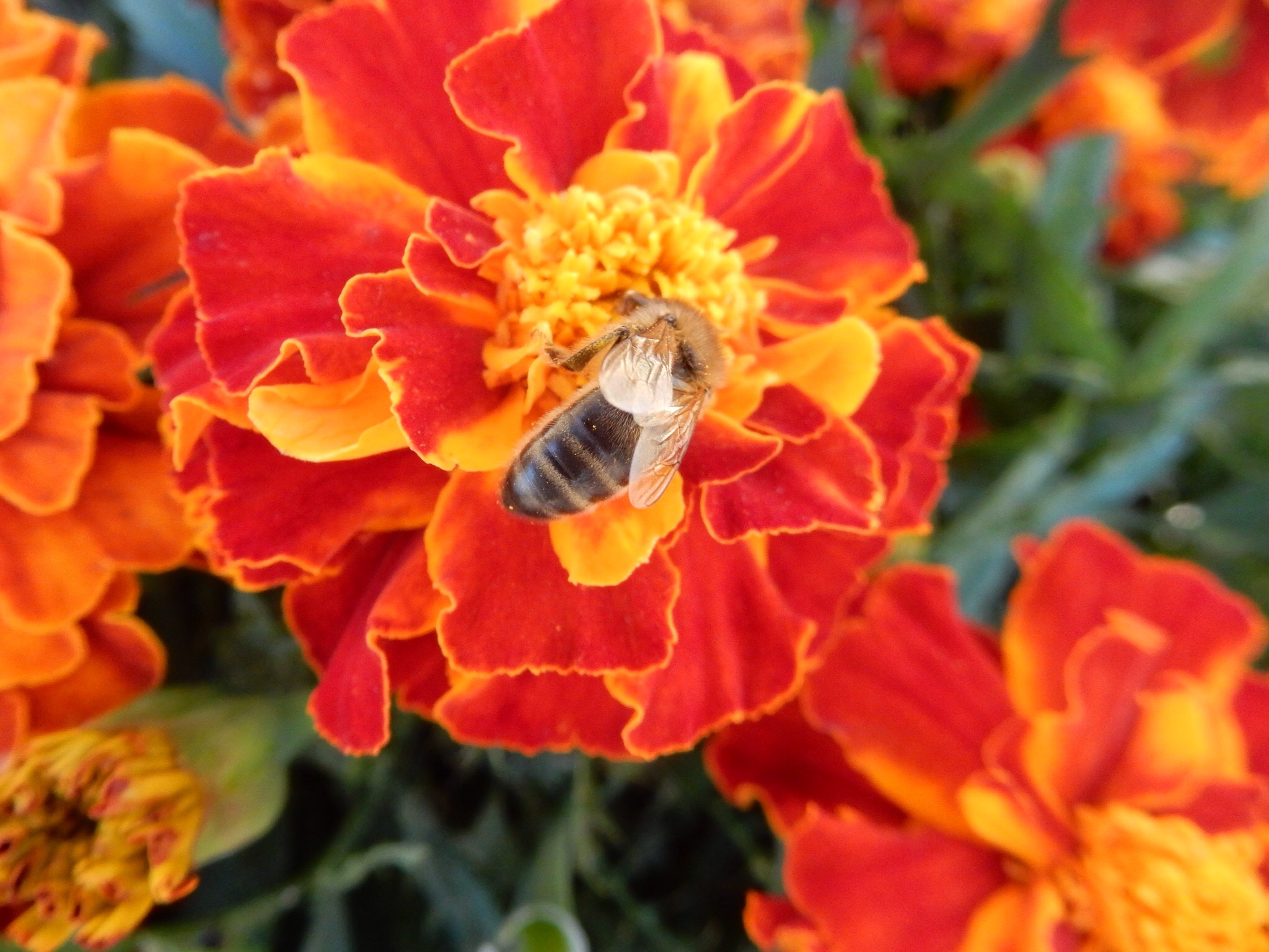 And now we are in Canovelles with the family, enjoying warm sunshine and getting ready for Christmas. On a stroll around the area we came across some planters full of marigolds where bees were busy collecting nectar.